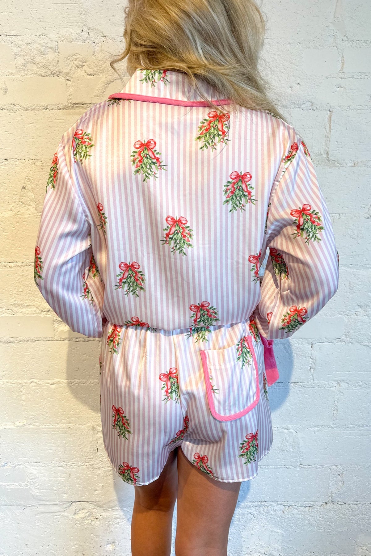 Whether you're sipping cocoa by the fire, wrapping gifts, or having a girls' movie night, these pajama shorts are made for merry moments and maximum comfort. Crafted from ultra-soft, breathable fabric, the Merry Mistletoe Shorts feature a relaxed fit with an elastic waistband and adjustable drawstring for the perfect cozy feel. The charming mistletoe print brings all the holiday cheer, while the flattering length and lightweight material make them ideal for sleeping or lounging all season long. Pair them with the matching top or your favorite oversized tee for a comfy, cute, and festive vibe you'll want to wear all December.