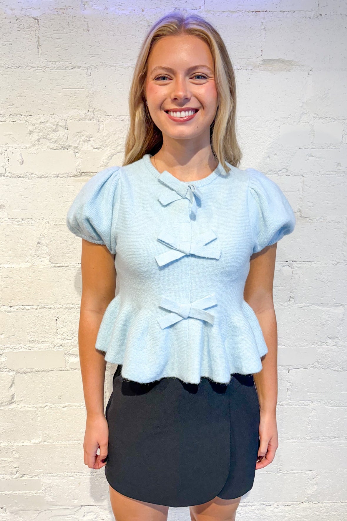 The Girl Next Door Top from Adeline Boutique is the definition of cute-meets-classic. This light blue beauty brings a touch of romance to your everyday wardrobe with its sweet puff sleeves, dainty bow details, and soft sweater-knit fabric that feels just as good as it looks. Designed for comfort and charm, this short-sleeve knit top offers a flattering, slightly fitted silhouette that pairs beautifully with everything from high-waisted jeans to mini skirts. The bow accents on the front add that perfect playful touch, while the light blue hue gives it a fresh, feminine vibe that’s ideal for spring days, coffee dates, or weekend brunch. Made with a soft, stretchy fabric that keeps its shape, the Girl Next Door Top is as easy to wear as it is to style. It’s that go-to piece you’ll reach for when you want to look put-together without trying too hard.