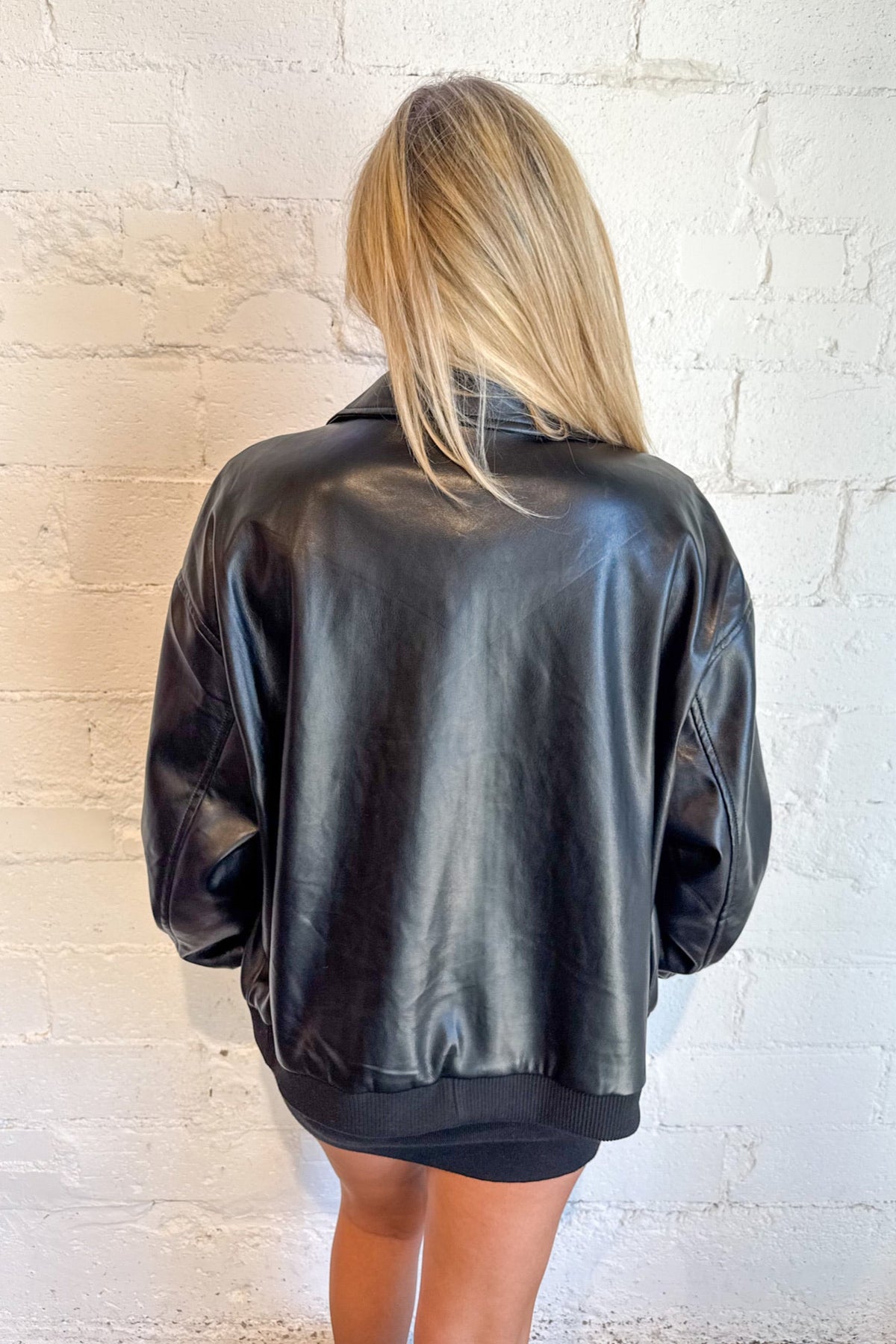 Add instant edge to any outfit with the Faux Leather Oversized Bomber Jacket—your new go-to layer for that effortlessly cool, model-off-duty look. This oversized bomber blends vintage streetwear vibes with modern sophistication, thanks to its luxe faux leather finish and relaxed, slouchy silhouette. Whether you're layering it over a crop top and cargos or tossing it on with a mini dress and boots, this jacket adds major attitude without trying too hard. Made from buttery-soft, vegan-friendly faux leather, this piece features classic bomber details—ribbed cuffs, a zip front, and roomy front pockets—reimagined in a perfectly oversized fit. The rich texture and slightly structured shape give it that borrowed-from-the-boys energy, while still feeling totally feminine and elevated.